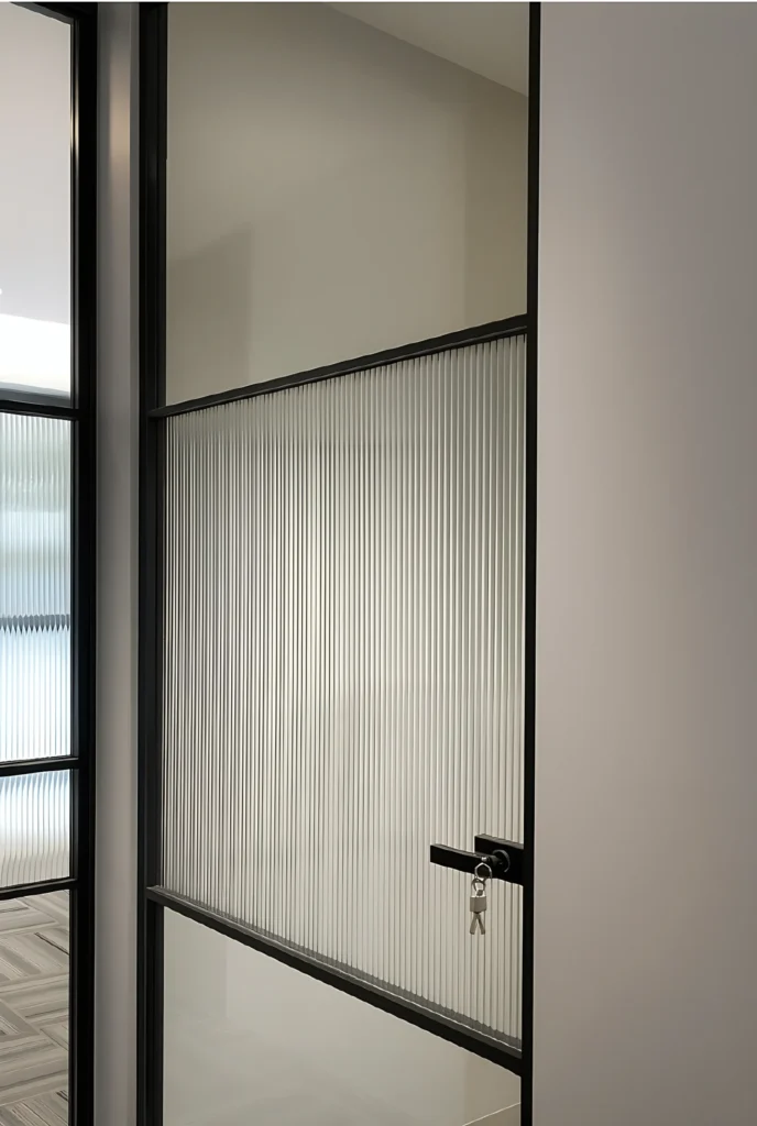 Aesthetic: The left photo shows the profiles used with fluted/ribbed glass to create a modern, sleek partition. The right photo displays the raw black aluminum samples.